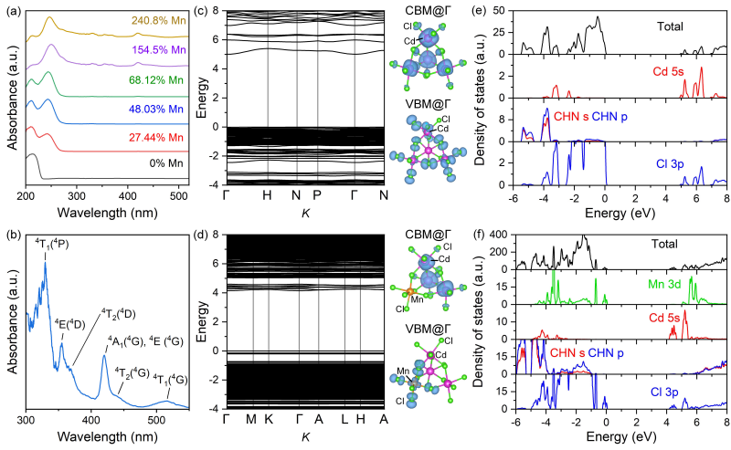 通过DFT计算与光谱分析表明:1和Mn-1晶体材料具有直接带隙(位于Γ点)特性,通过Mn掺杂实现d、p轨道杂化,打破六配位Mn的d-d跃迁禁阻,从而增强红光发射。