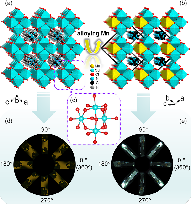 晶体1属于立方晶系的I-43m空间群,而Mn-1(以Mn0.81Cd3.19Cl1810–构筑单元为例)属于三方晶系的R3m空间群。这种空间群上的差异可以通过双折射实验来验证。Mn-1晶体在偏光显微镜下,从0° ~ 360°旋转时,可展示出四重明暗变化,而晶体1无任何变化。Mn-1晶体产生的双折射现象来源于它的各向异性,由其三方晶系的对称性所决定。而晶体1没有双折射现象,为各向同性,由立方晶系的对称性所决定。