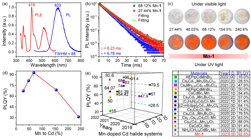 类钙钛矿型、四核金属卤化物晶体具有较强的蓝光/绿光吸收、较长的荧光寿命以及较高的荧光量子产率(~92.6 %的PLQY是已知的零维CdMn材料中较高的)。
