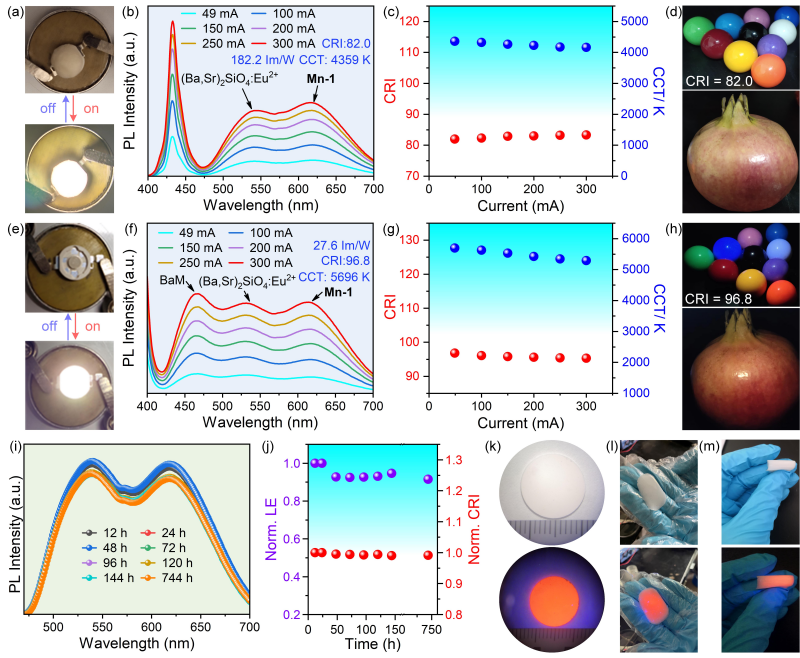 高的PLQY (92.6 %)、强的蓝光吸收和大的Stokes位移使得Mn-1晶体有望用于蓝光激发的WLED。在蓝光激发下,其流明效率可达182 lm/W,CRI为82。此外,还可以开发X射线闪烁体、荧光陶瓷片、柔性薄膜和荧光成像剂。