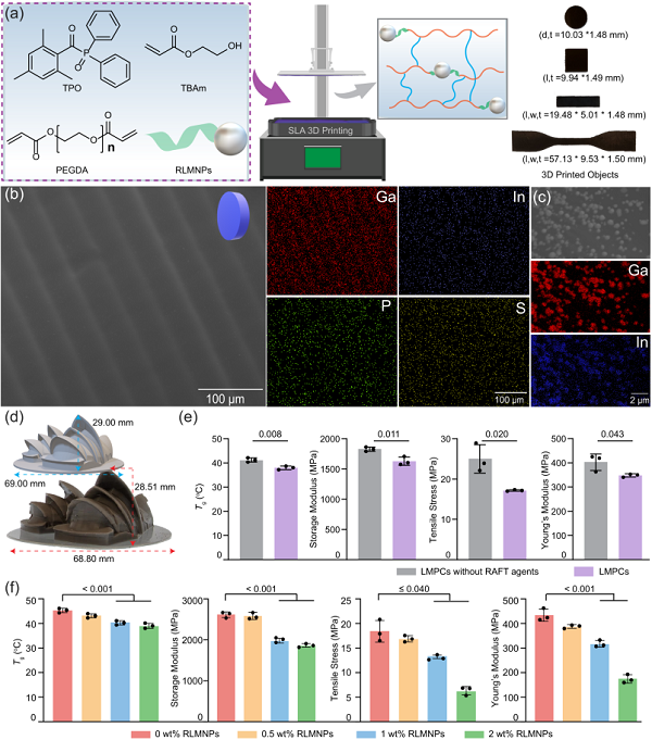 (a)以TPO为光引发剂,TBAm为单体,PEGDA为交联剂,RLMNPs为RAFT剂,制备3D打印复合物(LMPCs)的示意图。
