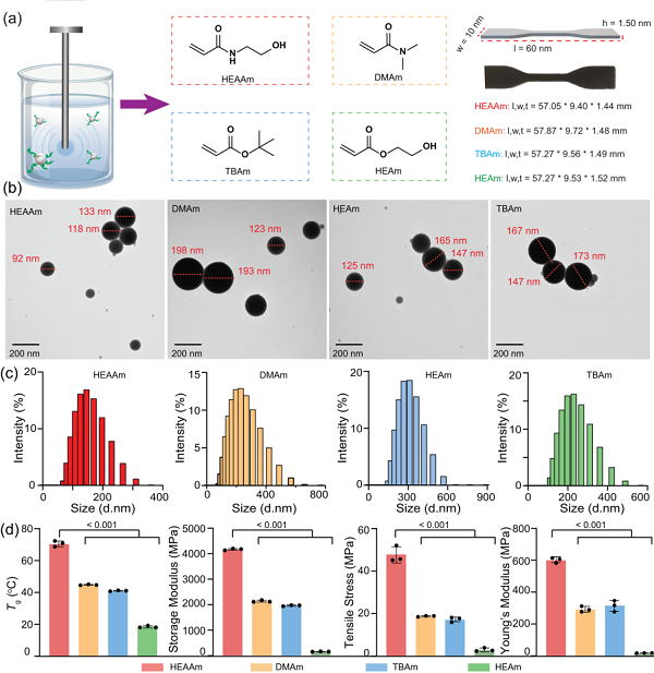 (a)分别以HEAAm、HEAm、TBAm和DMAm为主要单体,在不同的液体树脂中制备RLMNPs。
