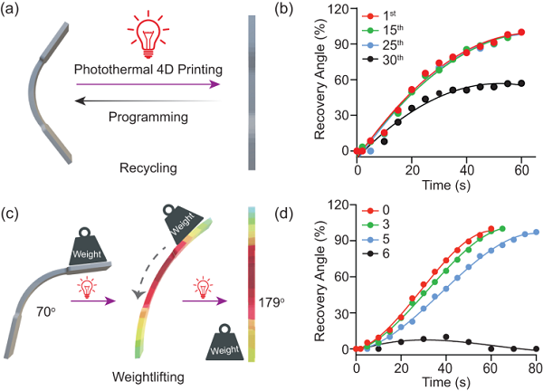 (a)形状记忆聚合物在重复编程和光诱导4D打印中的再循环过程。