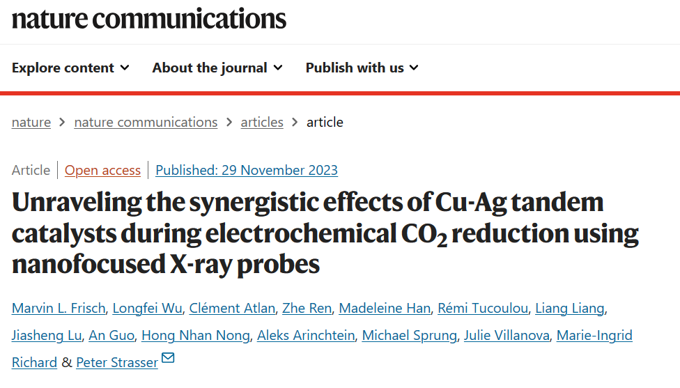 相关研究工作以“Unraveling the synergistic effects of Cu-Ag tandem catalysts during electrochemical CO2reduction using nanofocused X-ray probes”为题发表在国际顶级期刊Nature Communications上。