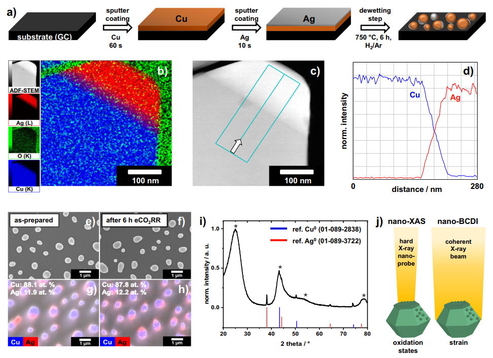 近日,柏林工业大学Peter Strasser教授在控制不同Ag摩尔分数的条件下合成并表征了双金属Cu-Ag串联NP模型催化剂,然后在eCO2RR条件下原位研究了它们的结构-活性-选择性关系。通过利用一个组合X射线纳米探针方法,通过原位纳米聚焦XAS (nano-XAS)和BCDI (nano-BCDI)跟踪化学(氧化)状态的演变,以及单个Cu-Ag NPs中的三维原子位移分布和局部应变。作者利用得到的结构-活性-选择性关系来制定串联纳米催化剂的设计指南,这些催化剂可以提高总(C1和C2+) CO2还原产物的产量,同时通过相分离的Ag结构域抑制竞争性的析氢反应(HER)。虽然这项研究的重点不是提高任何单一的二氧化碳还原产物收率,但它考虑了总二氧化碳还原产物收率,并提供了证据,表明Cu-Ag NP催化剂体系与单金属Cu NP相比,显著提高了耐腐蚀性。总之,所提出的表征Cu-Ag串联NPs的方法为鉴定催化活性位点提供证据,促进对eCO2RR复合物的基本理解。更广泛地说,这一贡献突出了纳米nano-XAS / nano-BCDI结合表征单个纳米级材料实体的力量。