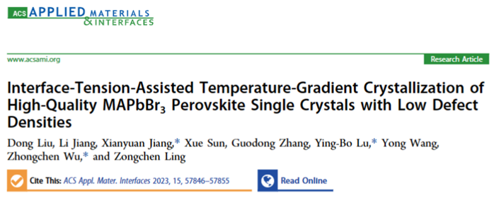 金属卤化物钙钛矿材料以其优异的光电半导体性能而被广泛应用于光电器件的研究,如太阳能电池、光电探测器、激光器、发光二极管和晶体管等。当前,多数钙钛矿基光电器件以多晶薄膜制备为主。与单晶相比,多晶薄膜表现出较差的电荷传输特性,并且容易发生化学降解。此外,钙钛矿单晶因其无扩展缺陷(晶界)而具有许多优点,包括高迁移率,长复合寿命,低离子迁移率和高稳定性。对于钙钛矿材料结晶,各国研究者已经开发了多种策略,包括逆温结晶,反溶剂蒸汽辅助结晶,配体辅助结晶,液相分离诱导结晶,高温熔融生长和液相降温结晶方法。其中,基于溶液的钙钛矿结晶方法是常用的选择。然而,在溶液中快速生长高质量的钙钛矿单晶依然面对诸多挑战。在控温结晶法中,热对流容易扰乱结晶秩序而形成大量缺陷。在反溶剂或配体辅助结晶法中,虽然排除了温度梯度的干扰,但精准控制反溶剂扩散难度较大。此外,反溶剂引起的区域的溶解度不均匀,易造成溶液组分的偏差,影响晶体质量。液相分离诱导结晶方法通过室温缓慢蒸发溶剂来能够制备出高质量的MAPbBr3单晶,但溶剂扩散缓慢,限制了单晶的生长速度。