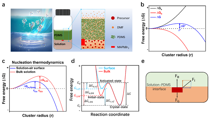 图1. MAPbBr3钙钛矿结晶与晶体生长。(a) PDMS辅助结晶原理图;(b) 形核半径与自由能的关系;(c) 溶液的表面和内部的形核半径的比较;(d)生长过程中自由能变化图解;(e)界面悬浮生长的力学图解。