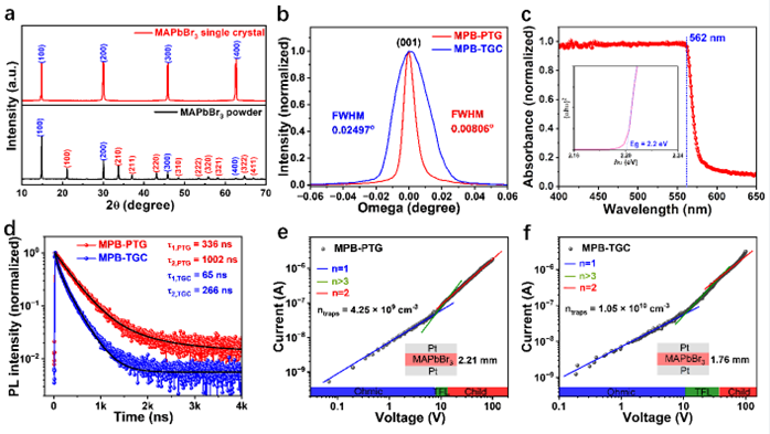 图2. MAPbBr3钙钛矿单晶的表征。(a) 粉末XRD和最大面XRD图谱;(b) XRD摇摆曲线;(c)吸收曲线和禁带宽度;(d) 荧光寿命曲线;(e)和(f) I-V测试曲线。