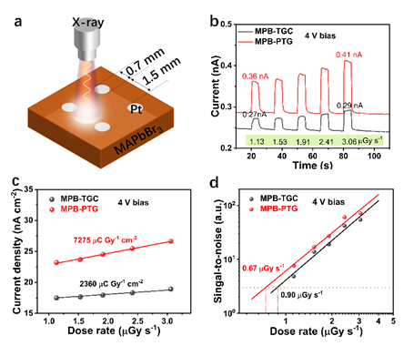 图3. MAPbBr3单晶探测器的x射线探测器。(a)结构图;(b)光电流响应;(c)灵敏度;(d)探测极限。