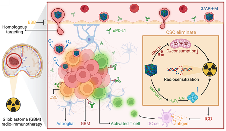 胶质母细胞瘤(glioblastoma,GBM)是一种侵袭性强、预后较差的中枢神经系统恶性肿瘤,目前,GBM的临床治疗主要是最大限度的手术切除和放化疗的联合治疗。但由于肿瘤缺氧环境和细胞成分的异质性(包括快速增殖的癌细胞和静息的癌症干细胞(CSCs),现有的放疗策略很难有效地控制GBM的生长与侵袭。