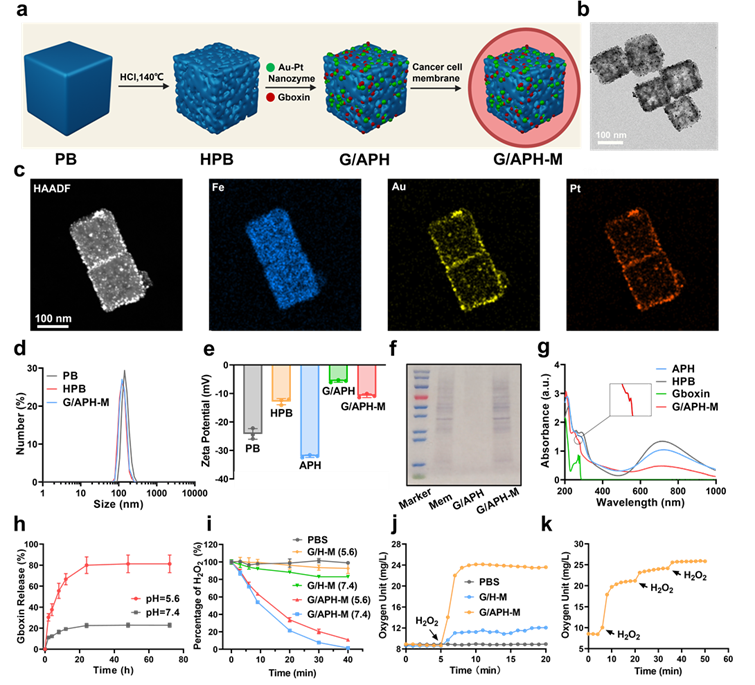 图2 一种装载了线粒体氧化磷酸化抑制剂的普鲁士蓝纳米酶仿生纳米平台(G/APH-M)的合成与表征