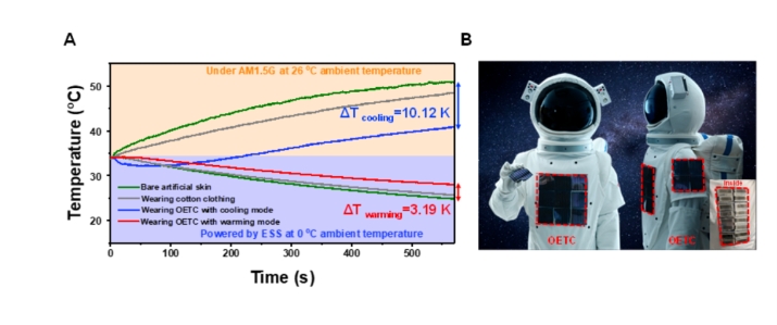 研究团队开发了一种体温调节服装系统,该系统将有机光伏与双向电热装置相结合,能够加热或冷却。该装置依靠阳光运行而无需额外电源,并且可以在各种恶劣环境中使用。