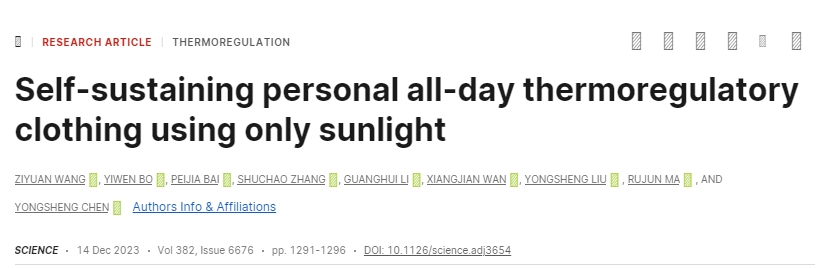 南开大学化学学院陈永胜教授、材料科学与工程学院马儒军教授、化学学院刘永胜教授科研团队通过整合柔性有机光伏(OPV)模块直接从阳光中获取能量和双向电热(EC)装置,开发了一种灵活和可持续的个人体温调节服装系统。柔性OPV-EC体温调节服装(OETC)可以将人体热舒适区从22°-28°C扩展到12.5°-37.6°C,具有快速体温调节速率。该系统同时能耗低、效率高,只需12小时的太阳光能量输入,便可实现 24 小时可控和双模式体温调节。这种自供电的可穿戴体温调节平台具有结构简单、设计紧凑、效率高、自适应能力强等特点,且以阳光为唯一能源。该研究成果以Self-sustaining personal all-day thermoregulatory clothing using only sunlight为题发表于Science上。化学学院2021级博士研究生王子源和材料科学与工程学院2021级博士研究生薄轶文为共同第一作者。陈永胜为第一通讯作者,马儒军、刘永胜为共同通讯作者,南开大学化学学院为第一单位。