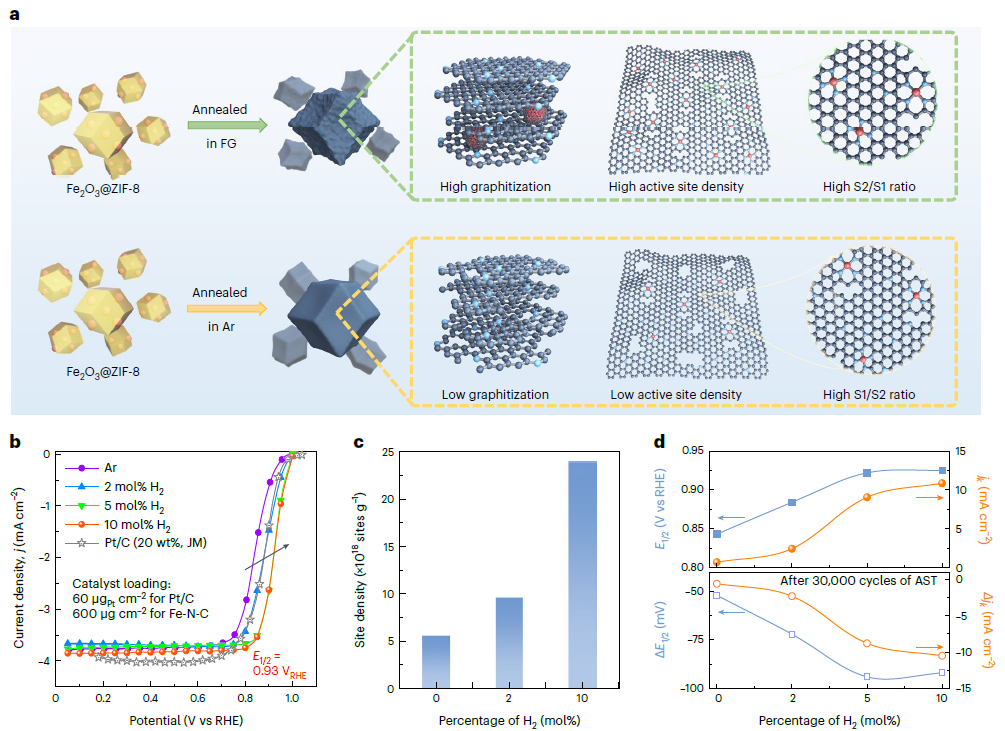 Fe-N-C催化剂是一种具有非铂族金属(PGM-free)的氧还原催化剂,可替代在酸性环境中Pt用于氢质子交换膜燃料电池(PEMFCs)的阴极氧还原反应(ORR)。然而,在过去的几十年里,由于对活性位点的理解不足、位点密度低、稳定性差以及活性-稳定性平衡的限制,Fe-N-C催化剂的性能和耐久性改进仍然有限。此外,要实现与当前Pt催化剂相当甚至更好的稳定性仍然是一个重大挑战,主要是由于在ORR过程中可能通过断裂Fe-N键发生脱金属化。因此,调控FeN4活性位点的电子和几何结构以调节吸附能、降低活化能并加强Fe-N键对于改善FeN4位点的内在活性和稳定性至关重要。为解决该难题,美国纽约州立布法罗大学的武刚教授课题组研究发现,通过改变气氛环境向传统惰性气氛中添加氢气而制备的Fe-N-C催化剂,可以调控FeN4位点的局部碳和氮配位结构及其位点密度,并从理论和实验上系统地分析了Fe-N-C的活性和稳定性的提升机制,创新性地从DFT阐释了Fe-N-C的活性和稳定性的提升机制。这工作为设计具有高活性、高稳定的PEMFCs的Fe-N-C催化剂奠定了基础。这项研究近日发表在Nature Catalysis期刊上,引起了不小的关注。