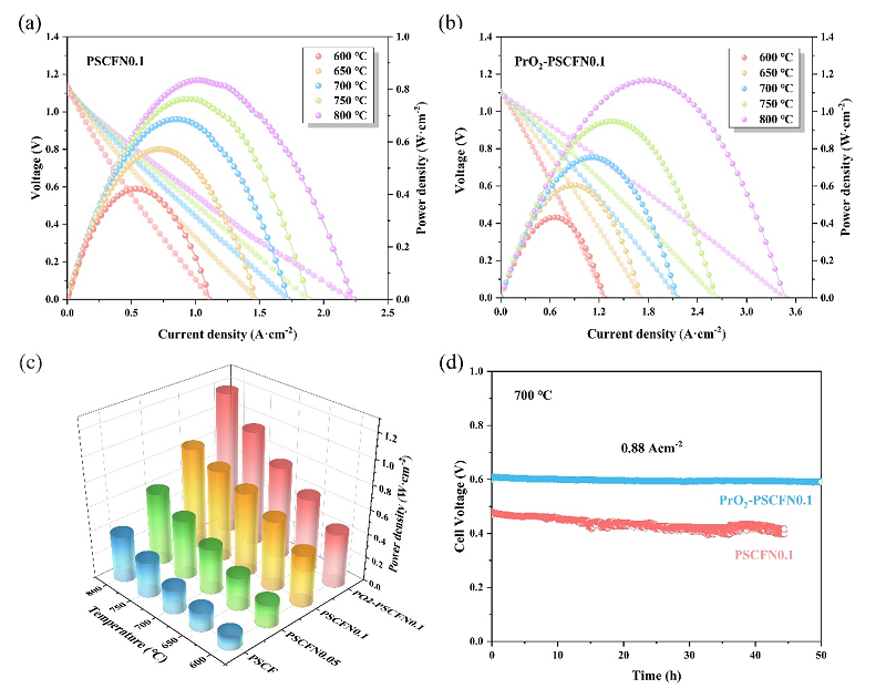 图9 (a) PSCFN0.1和 (b) PrO2-PSCFN0.1阴极的I−V−P曲线,(c) 使用PSCFNx和PrO2-PSCFN0.1阴极的单电池的峰值功率密度,(d) PSCFN0.1和PrO2-PSCFN0.1阴极单电池在700 ℃下的稳定性测试。