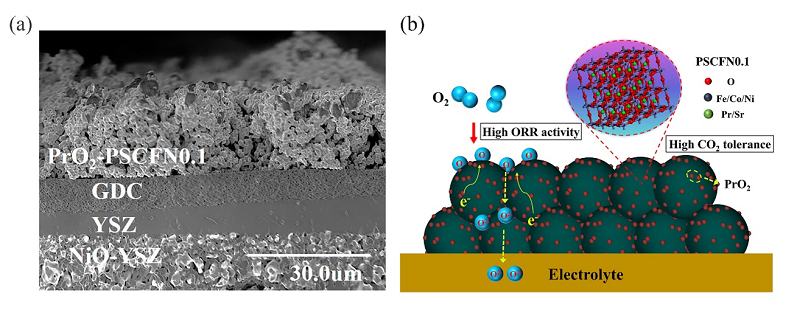 图10 (a) 以PrO2-PSCFN0.1为阴极的全电池50 h稳定性测试后的SEM横截面,(b) PrO2-PSCFN0.1增强ORR活性和CO2耐受性的机理图。