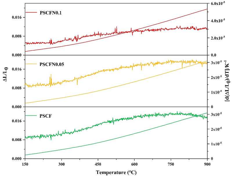 Ni掺杂对PSCFNx的TEC影响相对较小。一方面,Ni的加入导致氧空位浓度增加,导致TEC增加;另一方面,XRD分析证实,Ni掺杂导致晶胞体积减小,B-O键键能增强,导致TEC下降;在这些因素的共同影响下,样品的TEC在Ni掺杂前后变化不大。