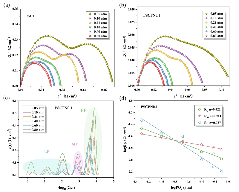 图6 (a) PSCF和(b) PSCFN0.1在700 ℃不同氧分压下的EIS图,(c) PSCFN0.1的DRT图,(d) PSCFN0.1的Rp与PO2的关系。