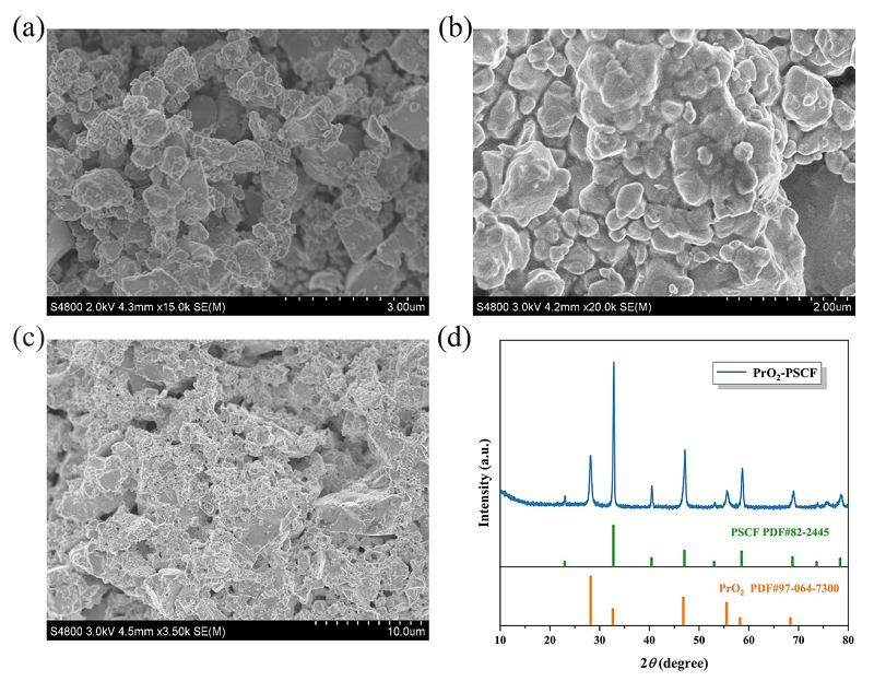 图7 PSCFN0.1 (a) 旋涂前和 (b) 旋涂后的SEM图,(c) 旋涂后的PSCFN0.1在600 ℃烧结2 h的SEM图,(d) PrO2-PSCFN0.1的XRD图谱。