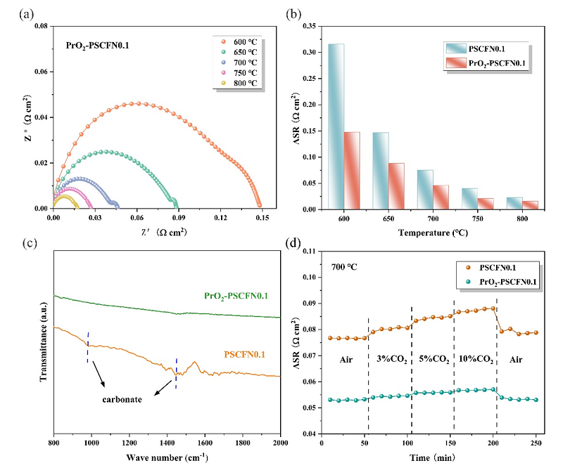 图8 (a) PrO2-PSCFN0.1的EIS图,(b) PrO2-PSCFN0.1和PSCFN0.1在600-800 ℃温度范围内的Rp值,(c) CO2处理的PrO2-PSCFN0.1和PSCFN0.1在600 ℃时的FT-IR光谱,(d) 不同CO2浓度下PSCFN0.1和PrO2-PSCFN0.1氧电极的Rp值。