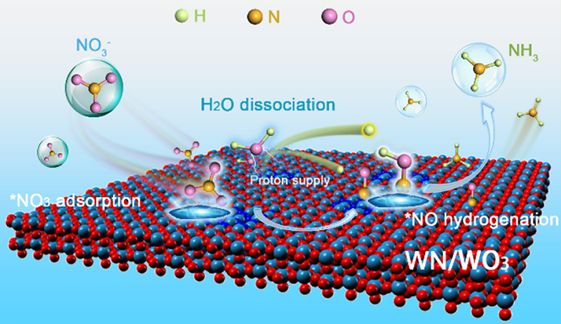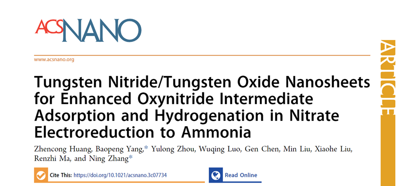 近日,来自中南大学的张宁教授团队,在国际知名期刊ACS Nano上发表题为“Tungsten Nitride/Tungsten Oxide Nanosheets for Enhanced Oxynitride Intermediate Adsorption and Hydrogenation in Nitrate Electroreduction to Ammonia ”的研究论文。该论文设计了WN/WO3异质结构纳米片来优化*NOx的吸附并促加氢,极大的促进了NO3–还原合成NH3的过程。理论计算表明,将WN局部引入WO3将缩短相邻W原子之间的距离,导致*NO3和*NO2以双齿配体的形式吸附在W活性位点上,该吸附形式比原始WO3的单齿配体的吸附形式更加强烈,利于后续还原反应。此外,引入的WN促进了H2O离解为NO2氢化提供了必要的质子,从而实现了一个高效地硝酸根还原制氨过程。该研究工作开发了一种简单有效的异质结构策略,以调节NOx的吸附和氢化,从而提高从NO3–还原合成NH3的效率。