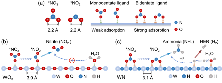 要点一:通过密度泛函理论(DFT)计算发现,将WN局部引入WO3基体中形成WN/WO3异质结构可以缩短WO3中相邻W原子的距离,这将使得*NO3和*NO2更倾向于通过双齿配体的形式吸附在W活性位点上,该吸附形式比原始WO3的单齿配体的吸附形式更加强烈,从而提高对*NOx的吸附。此外,WN/WO3中的WN物种可以促进H2O解离以提供质子,并且WN/WO3异质结构的形成抑制了WN的析氢(HER)过程。优化的*NO2吸附和足够的质子提供导致*NO2在WN/WO3上氢化的反应能垒降低,从而有利于NH3的生成。