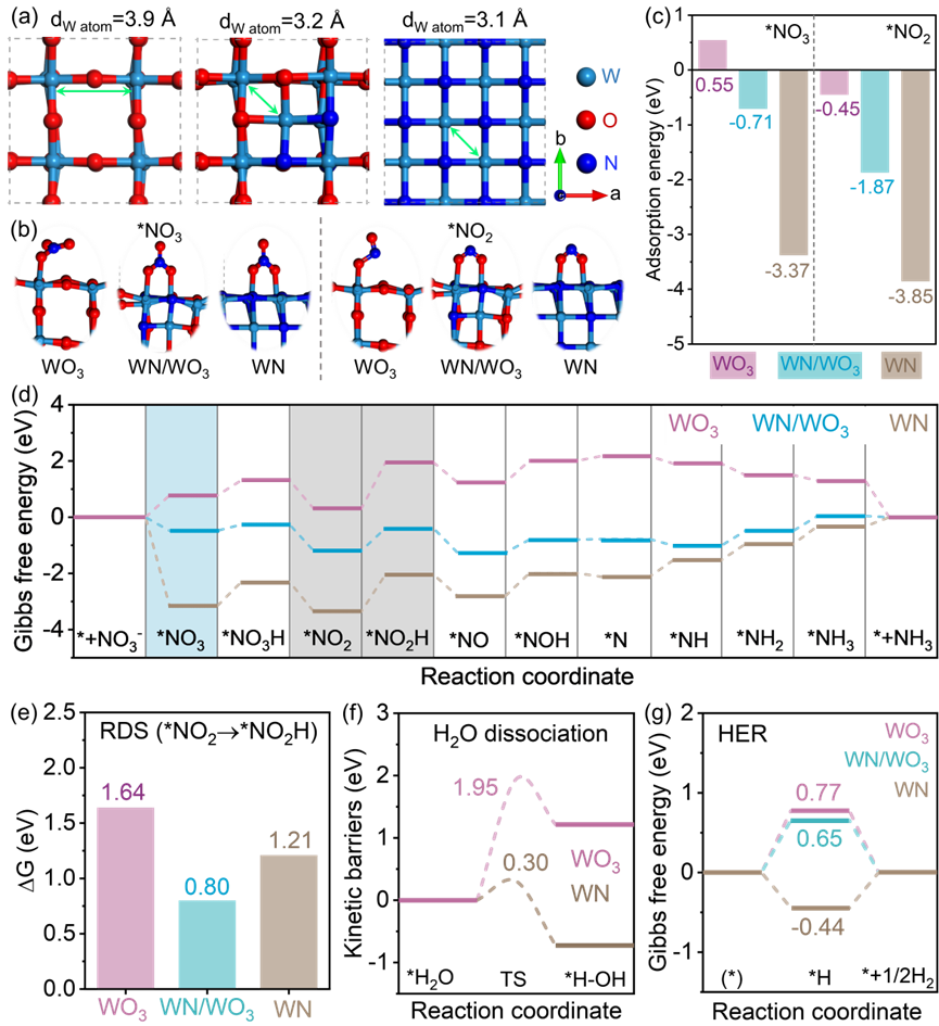 Figure 2. DFT calculations. (a) Surface atomic structures of WO3, WN/WO3, and WN. (b) The adsorption configurations of *NO3 and *NO2 intermediates on WO3, WN/WO3, and WN surfaces. (c) The adsorption energies of *NO3 and *NO2 intermediates on WO3, WN/WO3, and WN. (d) Reaction Gibbs free energies for different reaction intermediates on the surfaces of WO3, WN/WO3, and WN. (e) The reaction Gibbs free energy changes (ΔG) of the rate-determining step (RDS) over WO3, WN/WO3, and WN. (f) H2O dissociation process on WO3 and WN. (g) HER process on WO3, WN/WO3, and WN.