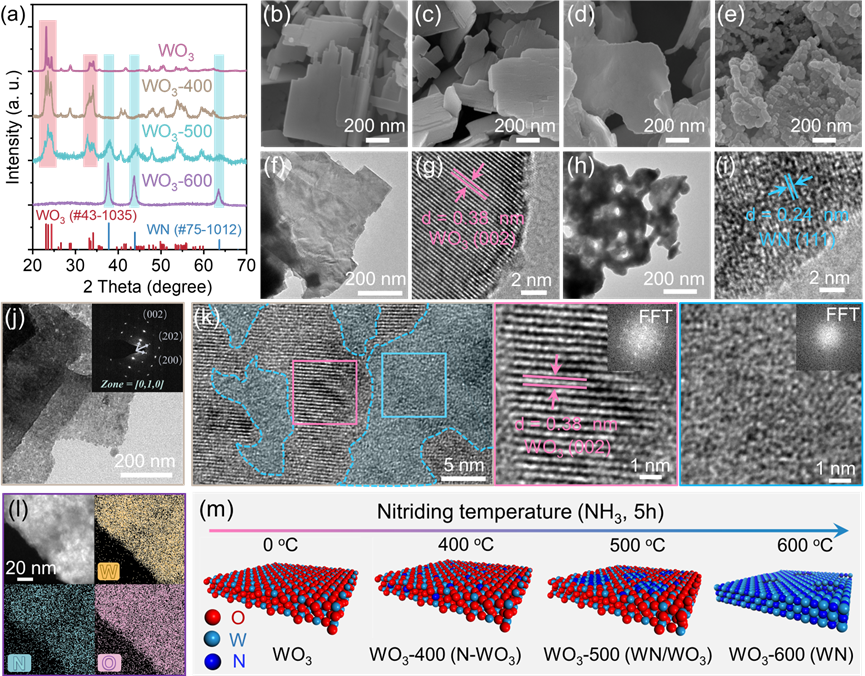 Figure 3. Structure characterizations. (a) XRD patterns of WO3, WO3-400, WO3-500, and WO3-600; (b–e) SEM images of (b) WO3, (c) N-WO3, (d) WN/WO3, and (e) WN; (f) TEM and (g) HR-TEM images of WO3; (h) TEM and (i) HR-TEM images of WN; (j) TEM image and the selected area electron diffraction (SAED) of WN/WO3; (k) HR-TEM and enlarged HR-TEM images of WN/WO3; inset is the corresponding FFT diffractions; (l) HAADF-STEM image of WN/WO3 and corresponding EDX elemental maps of W, N, and O. (m) Structure evolution process of WO3 nanosheets under different nitriding temperatures.