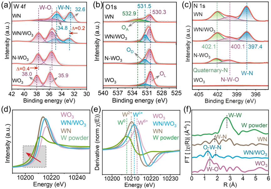 Figure 4. Surface chemical state and electronic state investigations. (a–c) High-resolution XPS spectra of (a) W 4f, (b) O 1s, and (c) N 1s. (d) Normalized W L-edge XANES spectra, (e) derivative-normalized W L-edge XANES spectra, and (f) Fourier transform magnitudes in R space of the W L3-edge for WO3, WN/WO3, WN, and W powder.