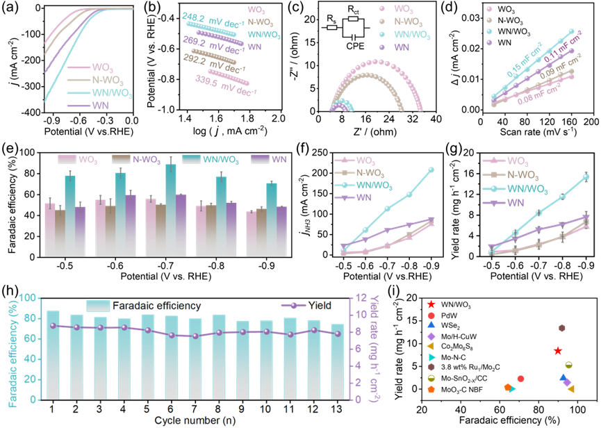 Figure 5. The NH3 production performances over WO3, N-WO3, WN/WO3, and WN. (a) The LSV curves during NO3RR. (b) The LSV-derived Tafel slopes. (c) The electrochemical impedance spectra (inset is the fitting equivalent circuit model, Rs is solution resistance, Rct is change-transfer resistance, CPE is constant phase element). (d) The electrochemical active surface areas. (e) Faraday efficiencies of NH3 production under different potentials. (f) Partial current density of NH3 production under different potentials. (g) Yield rate of NH3 at different potentials. (h) Cyclic stability of WN/WO3 at the potential of –0.7 V vs. RHE. (i) The performance comparison of WN/WO3 with other reported catalysts.
