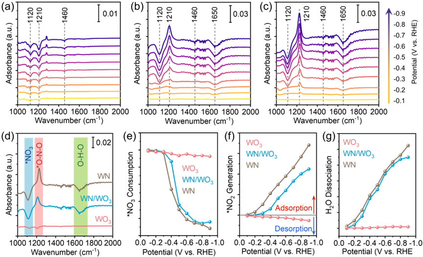 Figure 6. In-situ electrochemical characterizations. (a-c) In-situ FT-IR spectra of (a) WO3, (b) WN/WO3, and (c) WN at different applied potentials. (d) The comparison of in-situ FT-IR spectra for WO3, WN/WO3, and WN at the potential of −0.7 V vs. RHE. (e) The consumption of *NO3 intermediate over WO3, WN/WO3, and WN surfaces at different applied potentials. (f) The generation of *NO2 intermediate over WO3, WN/WO3, and WN surfaces at different applied potentials. (g) H2O dissociation over WO3, WN/WO3, and WN surfaces at different applied potentials.