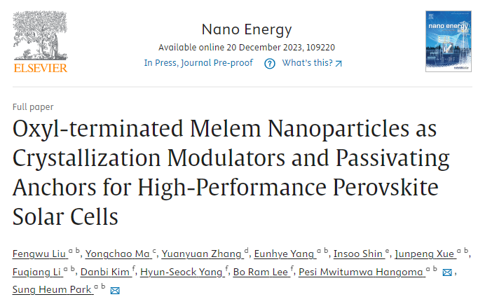 相关研究成果以“Oxyl-terminated Melem Nanoparticles as Crystallization Modulators and Passivating Anchors for High-Performance Perovskite Solar Cells”为题发表在Nano Energy上。韩国国立釜庆大学(Pukyong National University)Fengwu Liu为一作,Sung Heum Park教授为通讯作者。