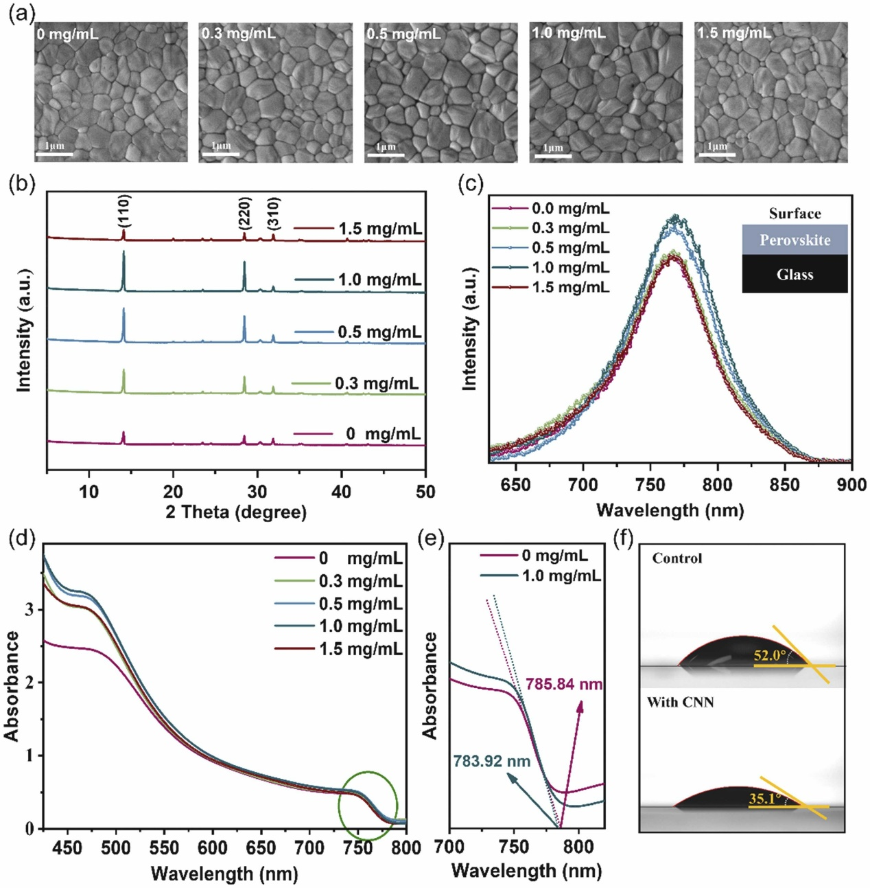 Fig. 5. SEM (a), XRD (b), PL (c) and (d) UV–vis absorption spectra of MA-based perovskite film prepared with different OMN concentrations on glass. (e) UV–vis absorption spectra of the control and the OMN-perovskite film, respectively. (f) Contact angle of MA-based control and with 1.0mg/ml OMN-perovskite film on CB.
