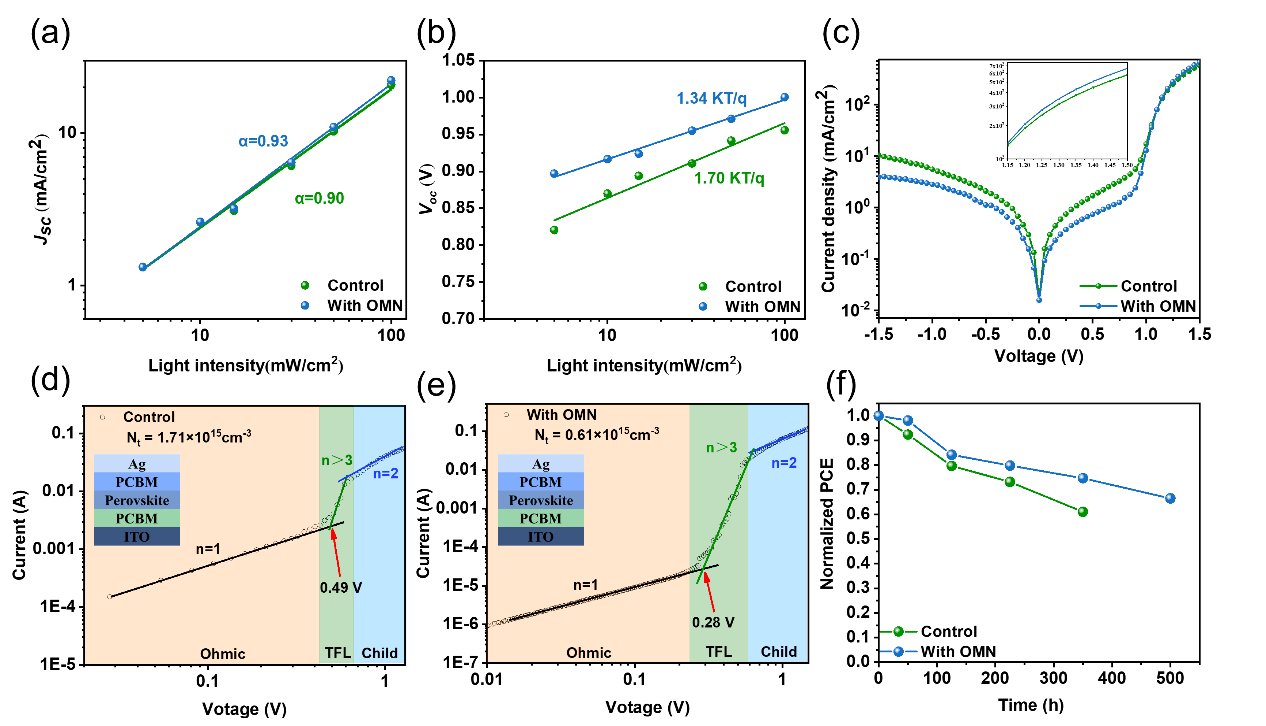 Fig. 7. Different irradiation intensities for MA-based device of (a) JSC and (b) Voc. (c) Dark J-V curves for MA-based control and OMN-modified PSCs. Dark J–V characteristics of MA-based (d) control and (e) OMN-modified device (the inset shows the device structure). (f) Stability testing of MA-based PSC devices at room temperature and in a nitrogen environment (H2O 30 ppm, O2 30 ppm).