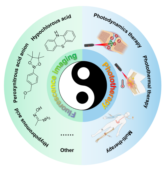 光学疗法和非侵入性治疗组合在关节炎的治疗中显示出了独特的潜力。在光照下,光疗将光转化为热或产生活性氧(ROS),促进关节炎炎症细胞坏死或凋亡;从而降低相关炎症因子的水平,缓解关节炎症状。与其他关节炎治疗方式相比,光疗不仅可以减小传统药物带来的副作用,还可以像许多荧光光敏剂一样作为生物成像的造影剂。因此,多种纳米材料已被用作光敏剂或光热剂,旨在通过光疗治疗关节炎。此外,可以设计光疗联合化疗(CT),杀死相关炎症细胞同时减轻关节内缺氧,提高治疗效果。