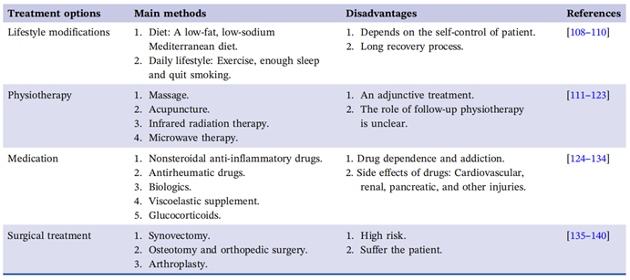 关节炎是一种以关节疼痛为特征的慢性退行性疾病,严重影响了人们的日常生活。据统计,全世界有超过3.5亿人患有关节炎。在人口基数大的中国,患者人数高达1亿;美国也有4000多万关节炎患者。如果不及时治疗关节炎,相关并发症可能导致关节功能丧失。肥胖者、运动员、关节受伤的体力劳动者和中老年人受关节炎的影响最大,但近年来有年轻化的趋势。关节炎的病因多种多样,包括性别、年龄、地理、环境因素、职业性膝关节屈曲、体力劳动、遗传、种族因素、关节细菌感染、维生素D缺乏和软骨钙沉积等。根据病因和症状,大约有150种疾病与关节炎有关。关节炎的常见临床形式有骨关节炎(OA)、类风湿性关节炎(RA)、痛风性关节炎、免疫性关节炎和滑膜炎症。