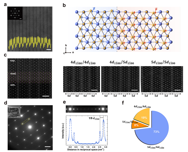团队采用了包括二次谐波生成、四维扫描透射电子显微术(4D-STEM)和面内压电力显微镜等多种表征分析技术,深入研究了βʹ-In2Se3的亚铁电调控结构和性质。统计分析了由Se原子位移而引起的纳米条带结构分布,发现非平衡宽度的纳米条带占主要地位,导致材料表现出净极化,从而在更大尺度上形成了亚铁电畴。这种独特的一维纳米条带结构体现了铁电性和反铁电性特性之间的竞争关系,为理解该类材料的复杂行为提供了新的视角。