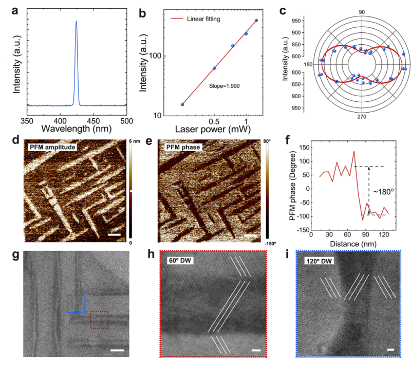 图4、亚铁电畴的二次谐波生成(SHG)、压电响应力显微镜(PFM)和亮场扫描透射电镜(BF-STEM)表征。图片来源:ACS Nano