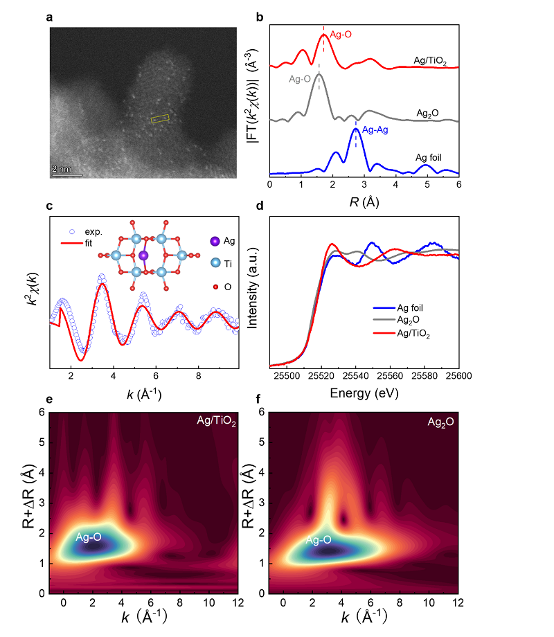 Fig. 2. (a) AC-HAADF-STEM image of Ag/TiO2. (b) FT-EXAFS spectra of Ag/TiO2, Ag2O and Ag foil. (c) EXAFS k space curves of Ag/TiO2. Inset shows the proposed local structure of single Ag atoms in Ag/TiO2. (d) Ag k-edge XANES spectra of Ag/TiO2, Ag2O and Ag foil. Wavelet transform of (e) Ag/TiO2 and (f) Ag2O.