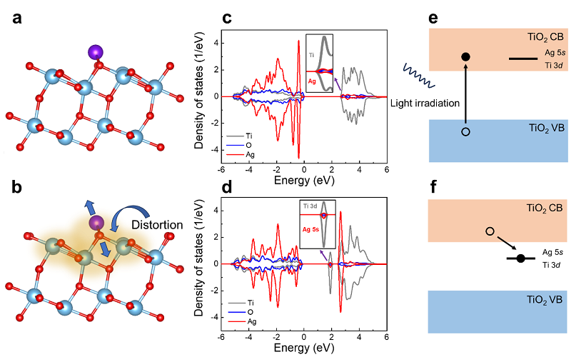 Fig. 4. Structure models of Ag/TiO2 at the (a) resting and (b) active state. The blue, red and purple balls represent Ti, O and Ag atoms, respectively. Density of states for Ag/TiO2 at the (c) resting and (d) active state. Schematics of (e) photo-electron generation upon illumination and (f) its localization at the mid-gap states.
