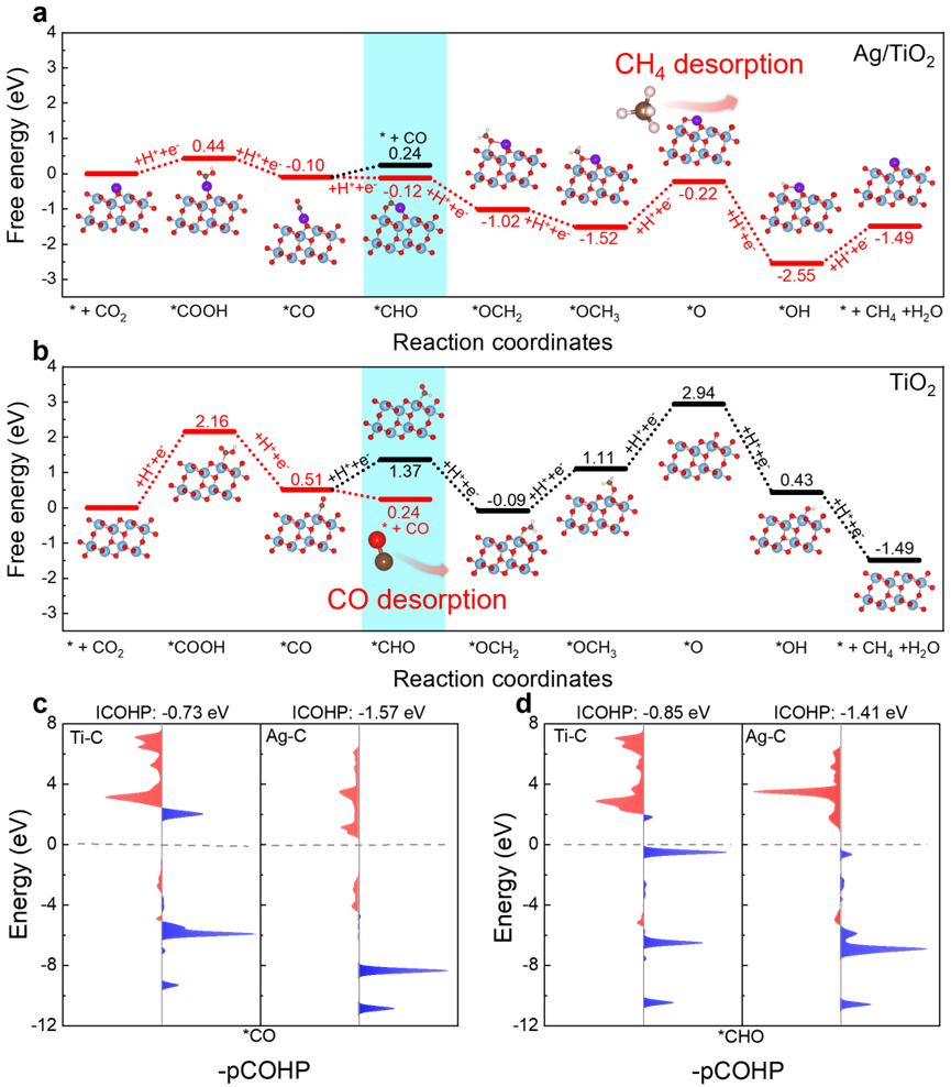 Fig. 7. Free energy diagrams of photocatalytic CO2 methanation and corresponding optimized structure at each state on (a) Ag/TiO2 and (b) TiO2. The energetically favorable reaction paths are represented by red lines. The blue, red, purple and white balls represent Ti, O, Ag and H atoms, respectively. pCOHP of (c) *CO and (d) *CHO adsorption at the Ti (left panel) and Ag (right panel) on Ag/TiO2, respectively.