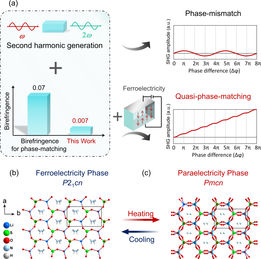 图1 (a) 双折射相位匹配和准相位匹配对比示意图;(b) LiNH4SO4晶体铁电相;(c) 顺电相晶体结构示意图