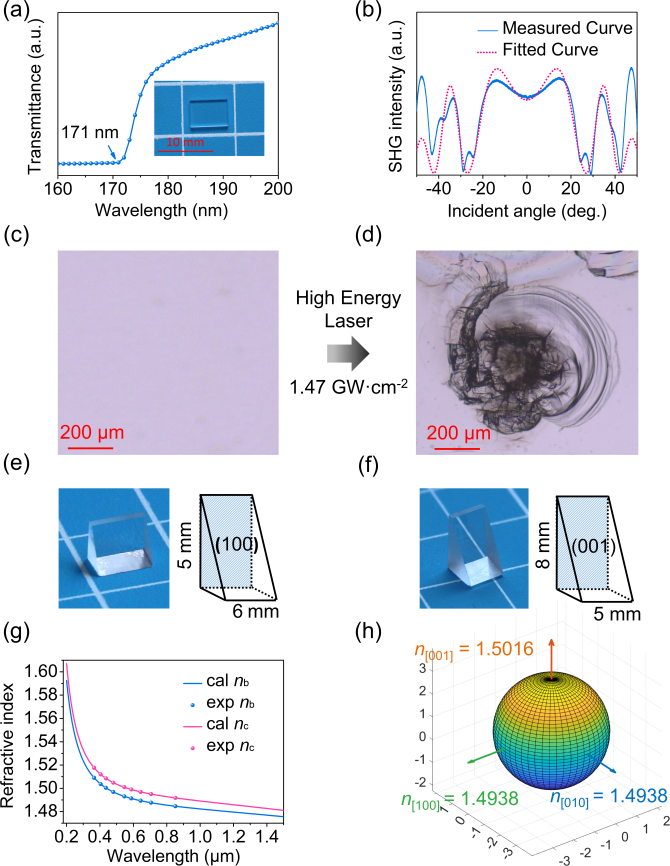 图3 (a) LiNH4SO4晶体深紫外透过光谱;(b) LiNH4SO4晶体Maker条纹;(c) LiNH4SO4晶体被纳秒激光损伤(d)前(e)后的光学显微图像;用于LiNH4SO4折射率的三角棱镜(e) (100)方向通光;(f) (001)方向通光;(g) LiNH4SO4晶体折射率色散方程;(h) LiNH4SO4晶体532 nm处光率体