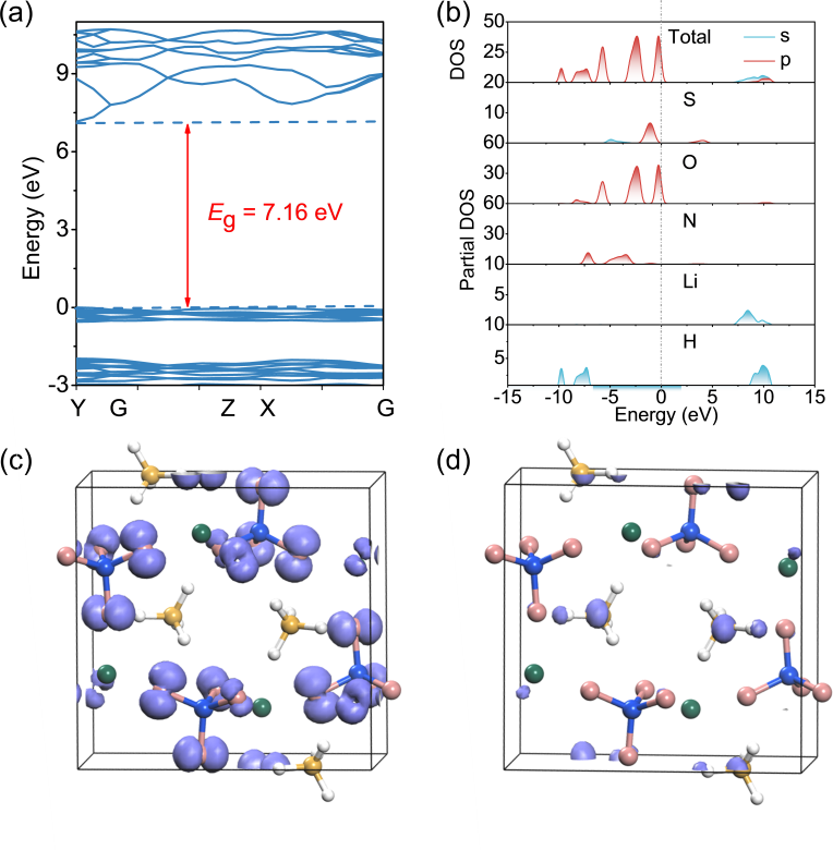 图5 LiNH4SO4的电子能带结构;(b) LiNH4SO4的态密度/部分态密度图;(c) LiNH4SO4的HOMO;(d) LiNH4SO4的LUMO