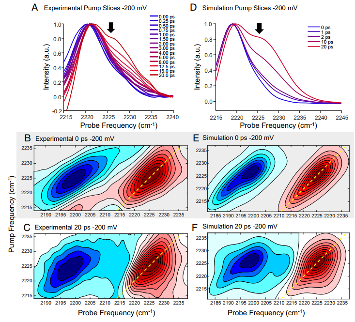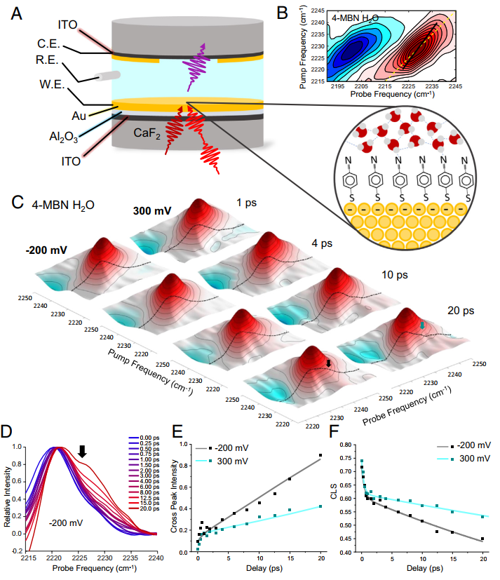 图1 在去离子水中施加电位下拴在金上的4-MBN单层的表面增强二维红外光谱 ©2023 National Academy of Science