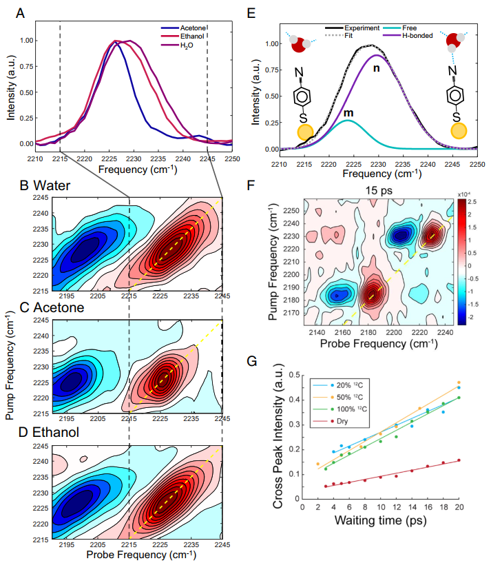 图2 4-MBN单层膜在不同溶剂和同位素稀释实验中的表面增强二维红外光谱 ©2023 National Academy of Science