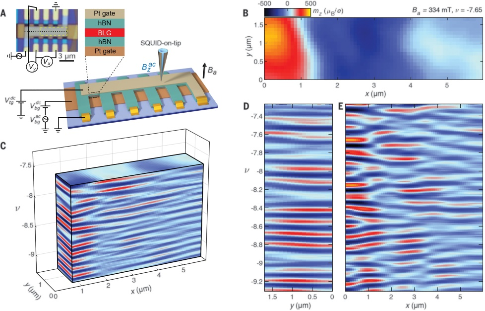 为了研究磁化振荡,研究人员非常灵敏的磁力计(一种超导量子干涉装置)放置在pipette锋利顶端,扫描了莫尔石墨烯样品,结果探测到了磁化振荡的模式,并利用这些数据重建了复杂的能带结构。