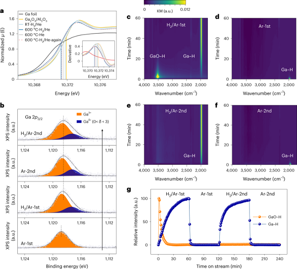 为了明确H2的作用,研究人员进一步研究了H2诱导的催化剂结构变化。在用不同气体连续处理催化剂的过程中,通过原位XANES检测了镓的价态,表明在暴露于H2时,氧化铝支撑Ga2O3的缺陷表面会形成可转移的氢化镓,而由此产生的氢化镓对路易斯酸镓位点催化的PDH有潜在的积极作用,随后用DFT计算进行验证。