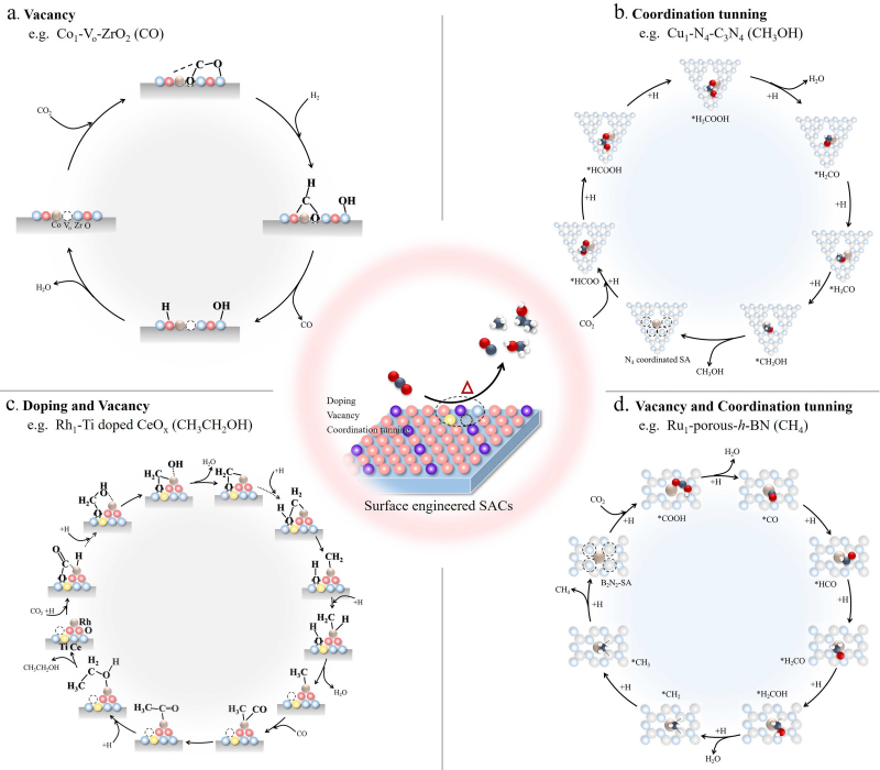 图9. 表面工程的SACs用于热催化CO2还原的一些反应路径。