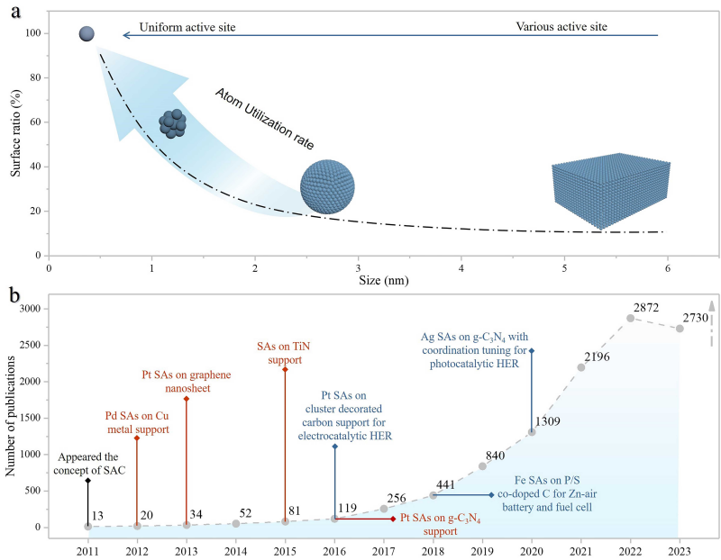 图3. SACs与其他催化剂的对比以及表面工程单原子材料的发展。